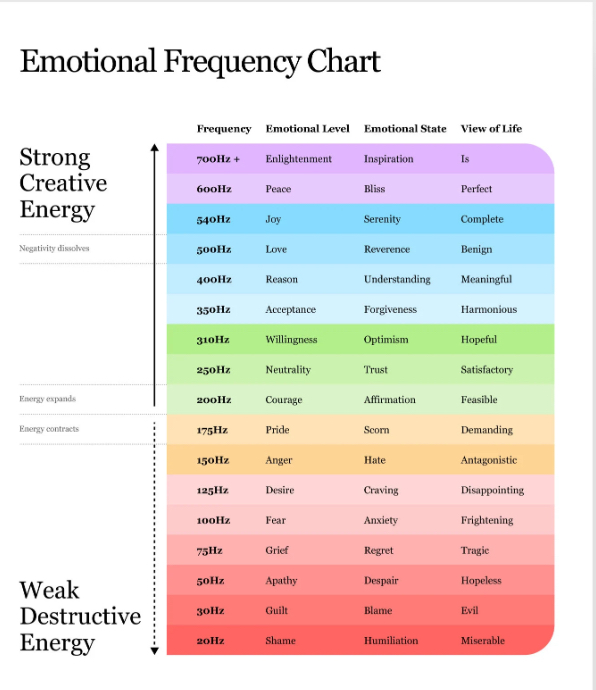 Emotions also vibrate at different frequencies. To support your understanding, I am attaching an Emotional Frequency Chart to this blog post.