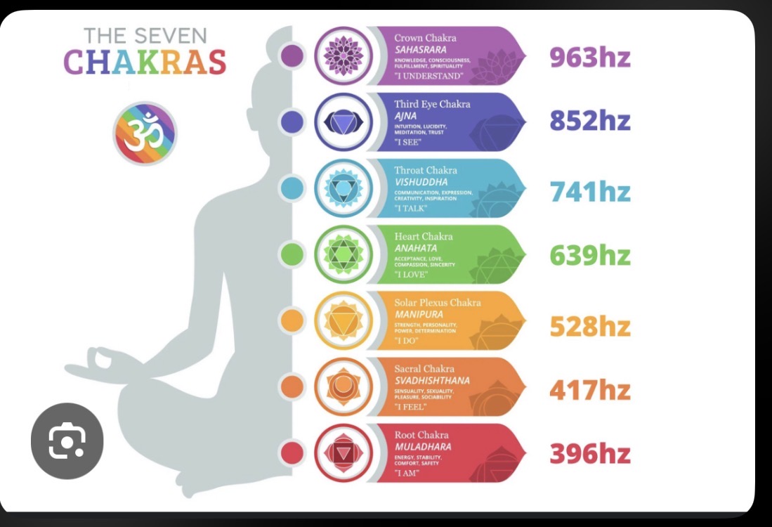 Each chakra responds to specific frequencies (measured in Hertz). Sound healing uses vibration to gently support these energy centers and help bring them back into harmony.